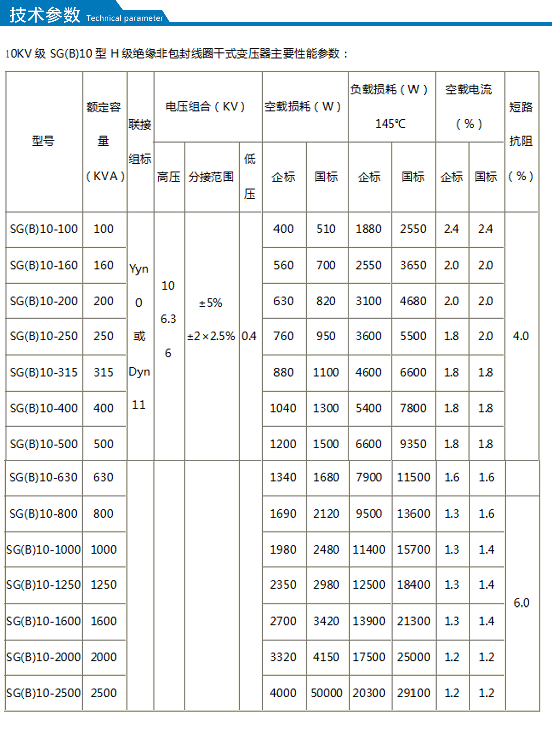 根據不同的使用環境,可配置不同的防護等級. 變壓器可按用戶需要帶有溫度控制和溫度顯示系統,可和溫控系統配合使用。 使用環境:戶內使用 正常使用條件:海拔不超過1000m。環境溫度最高 +40℃, 最低氣溫 -30℃ ,最高年平均氣溫 +20℃ (若與上述條件不符時,訂貨時詳細說明, 可按相應標準的有關規定,作適當的調整) 產品執行標準 GB1094.1~2-1996電力變壓器 GB1094.3.5-2003電力變壓器 GB1094.4-2005電力變壓器 GB1094.11-2007干式電力變壓器 GB/T 10228-2008干式電力變壓器技術參數和要求。