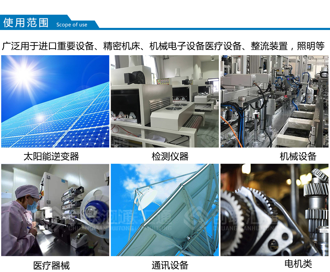 廣泛用于進口重要設備、機密機床、機械電子設備、醫療設備、整流裝置、照明等,安裝場所應無嚴重影響變壓器絕緣強度的氣體,蒸汽,化學性沉積,污垢,導電塵埃及無其他易爆易燃易腐蝕的物質。
