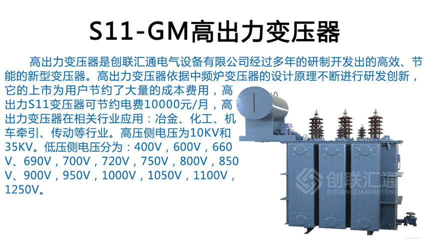 S11-GM高出力變壓器適用于冶煉廠(chǎng)、特別是鑄造廠(chǎng)、大型用電企業(yè)等,為用戶(hù)節(jié)省大量的固定電費(fèi),經(jīng)濟(jì)效益顯著。